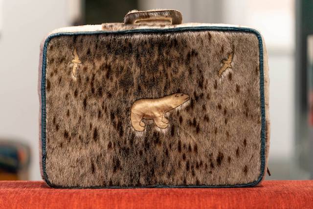 It’s a broad category. Next to the moose hide chief’s jacket is a birch bark baby carrier, beaded boots and fur-lined mitts. Adjacent display cases hold curved ladles carved from mountain goat horn, a suitcase covered in sealskin, black baskets of woven bowhead baleen, and an intricate formline box sculpted from argillite, a rare stone, by Haida master artist Charles Edenshaw.