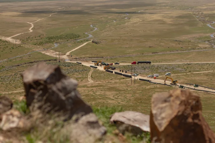 Down the hill, semi-trucks hauled stacks of large black pipes down gravel roads, leaving behind dust trails that floated across the desert and served as distant indicators of continued construction.