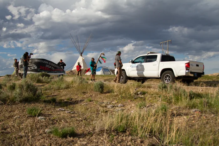 In May, elders from Nuwu, or the Fort McDermitt Paiute-Shoshone Tribe, gathered with land defenders and water protectors to expand their protest camp and block construction of the Thacker Pass Lithium Mine in northern Nevada. Together, the group built a second ceremonial tipi directly in the path of a water pipeline the mining company is building as an initial phase of its planned open pit mine.