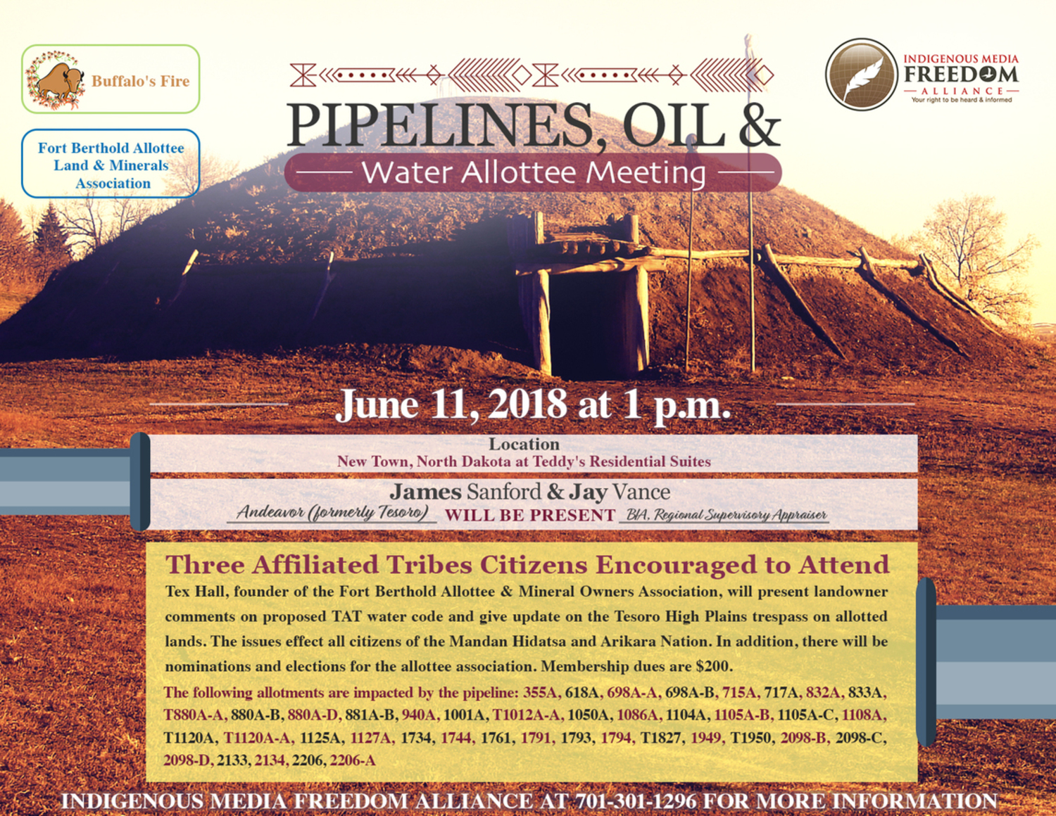On Monday, June 11, a meeting has been scheduled by the Fort Berthold Allottee and Mineral Owners Association and the Indigenous Media Freedom Alliance to discuss current negotiations with the pipeline company. In addition, allottees are set to discuss the Three Affiliated Tribes Tribal Business Council’s proposed water code.