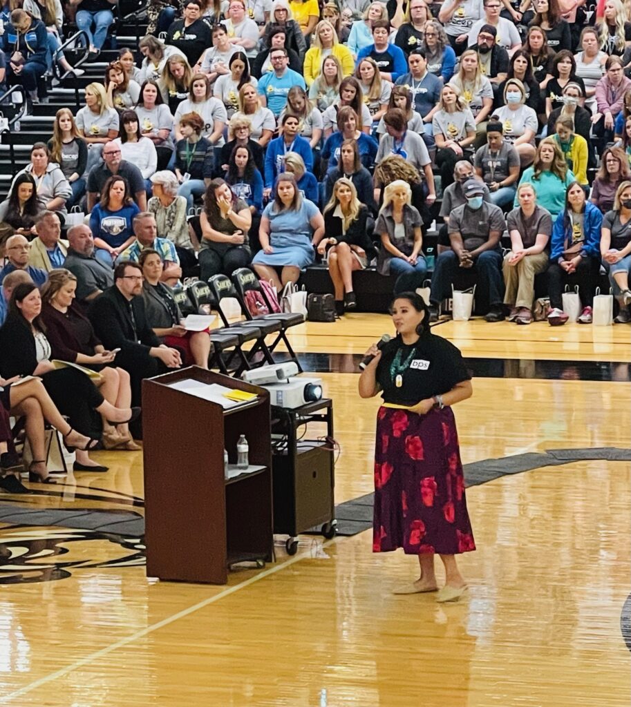 Sashay Schettler, Bismarck Public Schools Indigenous education director, delivers a land acknowledgement in 2021-22 to fellow school district staff members at Legacy High School in Bismarck, N.D. Schettler is a citizen of the Mandan, Hidatsa and Arikara Nation. Photo Credit/Bismarck Public Schools