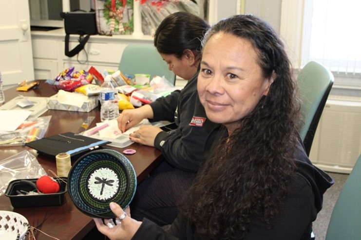 Hamann, who helped organize the mortarboard beading session, sat at the beading table and patiently weaved pine needles into a basket. Since learning how to weave, she’s made more than 70 baskets. The practice, she said, keeps balanced and rejuvenated.