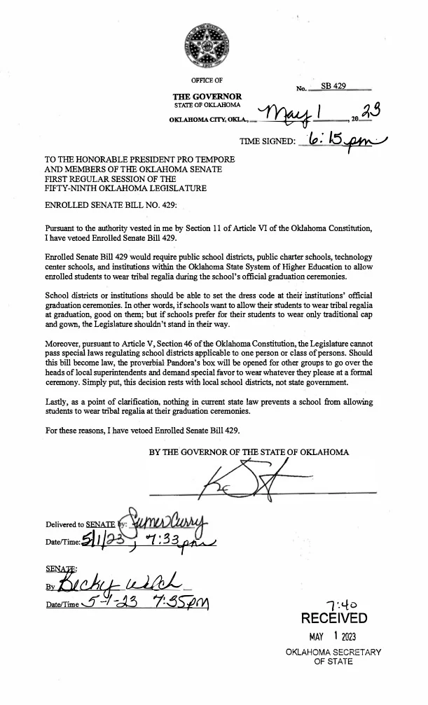 “We hope the House and the Senate will quickly override the veto to provide more freedom for Oklahoma students who want to honor their heritage,” he said in the statement.