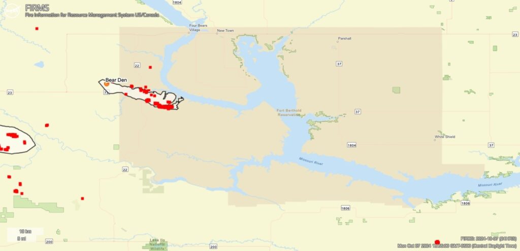 One of at least six outbreaks over the weekend, the Bear Den Fire near Mandaree remains 20% contained at time of publication. As of early afternoon more than 11,000 acres were actively burning, including significant portions of the Fort Berthold Indian Reservation.