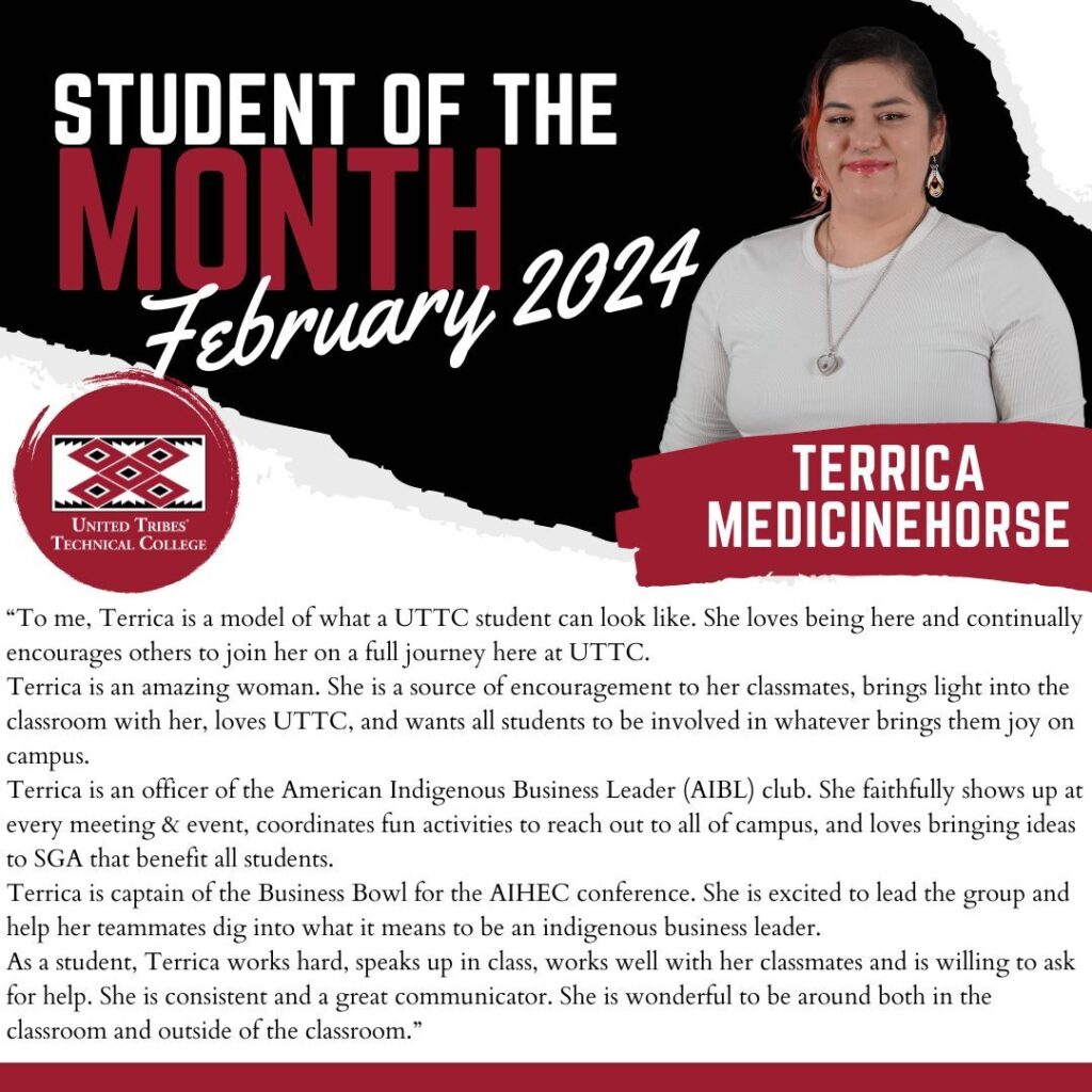 Terrica Medicine Horse cried when she found out she was chosen as United Tribes Technical College’s Student of the Month for February.