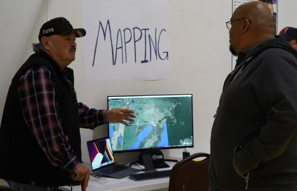Former Standing Rock Sioux Tribe Chairman Mike Faith discusses search areas with Spirit Lake Nation employee and Incident Command Center Team member Kenneth Greywater Jr. on April 27, 2024. (Photo Credit/Alicia Hegland-Thorpe)