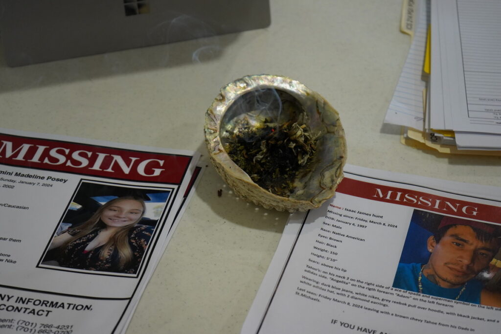 Sage burns at the Spirit Lake Wellness Center in Fort Totten, ICS Team Headquarters for the search for Gemini Posey and Isaac Hunt on April 27, 2024. (Photo Credit/Alicia Hegland-Thorpe)