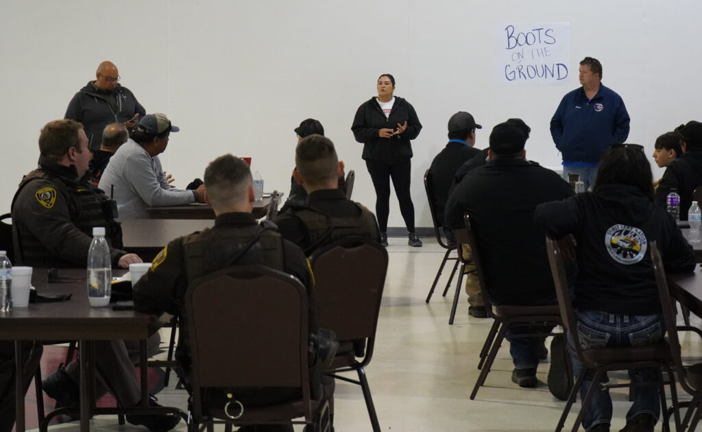 Jewel Azure, Spirit Lake Nation tribal employee and public information officer with the Incident Command Center team, addresses several different groups before the search teams deploy to look for Posey and Hunt, April 27, 2024. (Photo Credit/Alicia Hegland-Thorpe)