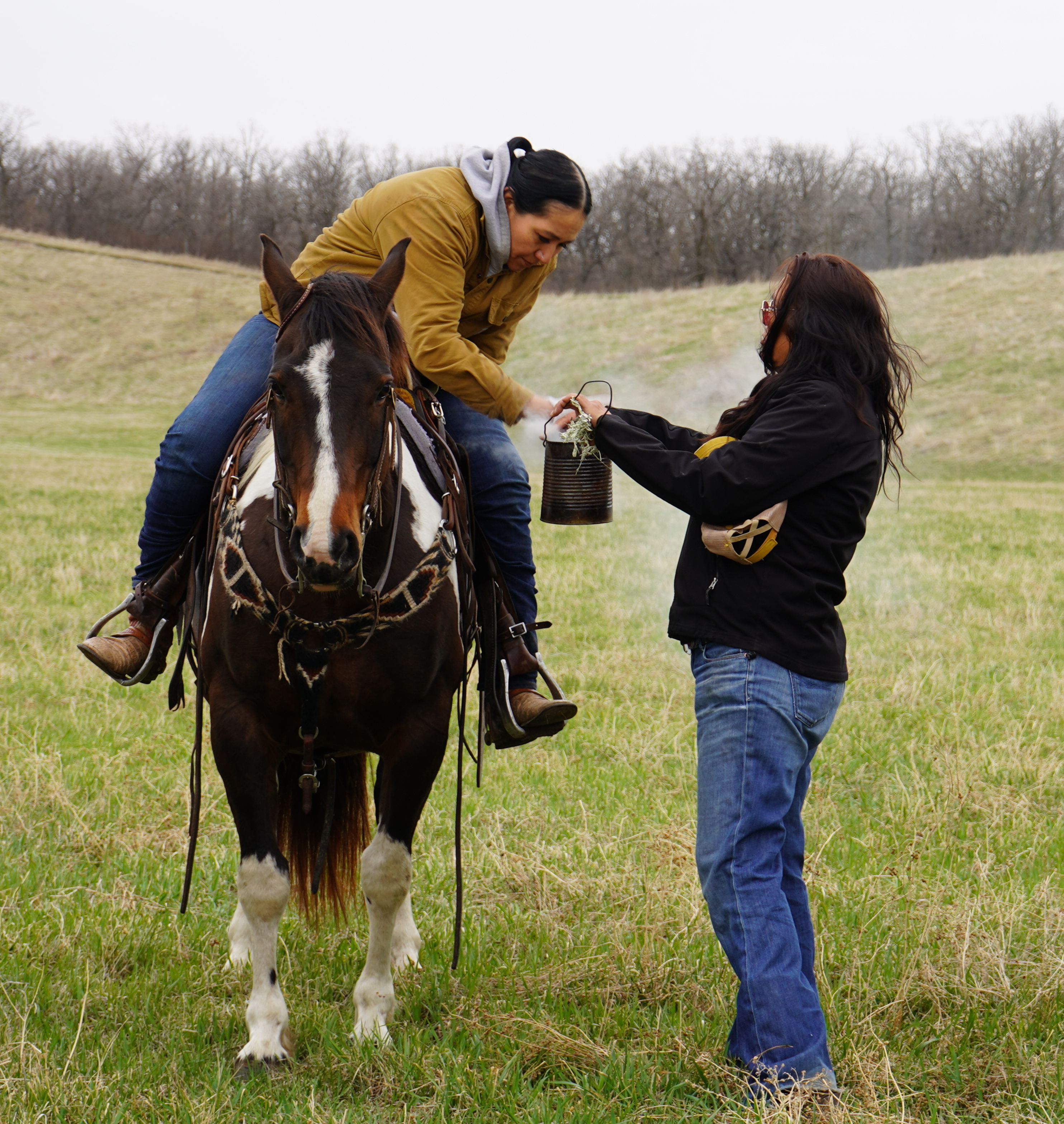 Alva Cottonwood-Gabe of Standing Rock MMIR and Horse Nation, two Standing Rock citizen groups, stands with Horse Nation Riders as they burn sage and prepare to search the treeline for missing Spirit Lake residents Jemini Posey and Isaac Hunt April 27, 2024. (Photo Credit/Alicia Hegland-Thorpe)