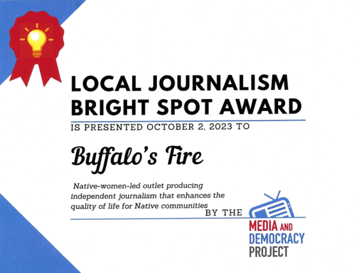 In a Media and Democracy Project Substack news release, project members wrote Buffalo’s Fire is a news outlet “dedicated to producing independent journalism that enhances the quality of life for Native communities, informing and engaging American Indians while sharing their stories with the broader culture. This recognition was based on their exceptional community reporting, which includes advocating for tenant rights in North Dakota to combat daily evictions and promoting sobriety and community-building in the Turtle Mountain homeless shelter.”