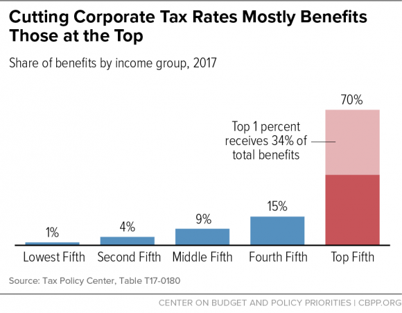 Treasury Secretary Steven Mnuchin claims that “many, many economic studies show that more than 70 percent of the burden of corporate taxes are passed on to the workers.” However economists are divided. As the Center for Budget and Policy Priorities points out “this claim is misleading … the evidence indicates that most of the benefits from a corporate rate cut would go to those at the top, with only a small share flowing to low- and moderate-income families. Mainstream estimates conclude that more than one-third of the benefit of corporate rate cuts flows to the top 1 percent of Americans, and 70 percent flows to the top fifth. Corporate rate cuts could even hurt most Americans since they must eventually be paid for with other tax increases or spending cuts.”