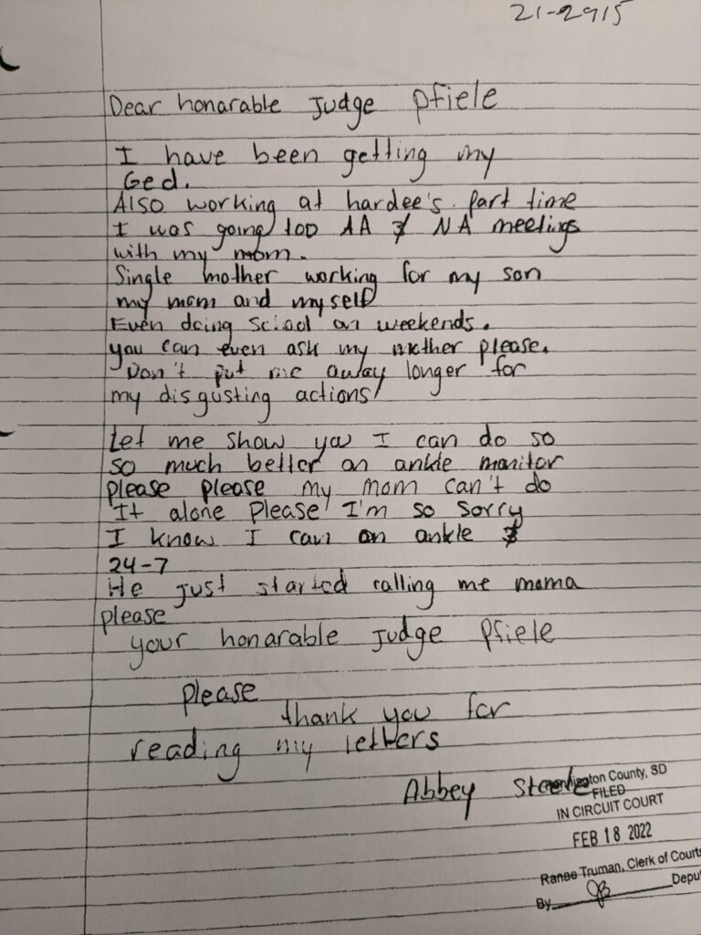 She was detained on warrants several times. On six occasions, beginning in February of 2022, she wrote letters to Judge Jane Wipf Pfeifle asking for another chance on 24/7. She mentioned her work at Wendy’s, illness in her family, her hopes for her children, and the strength of her mother and sister as a support system for staying sober. In one letter, she talked about picking up additional hours at Hardee’s and attending Alcoholics Anonymous and Narcotics Anonymous meetings.